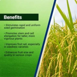 Gibberellic Acid acts by stimulating plant hormones that regulate growth. It promotes cell division and elongation, speeds up germination, induces flowering, and supports fruit development. It also breaks seed dormancy and enhances metabolic activity for robust growth.