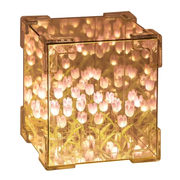 Cube Tulip Night Lamp is a unique and elegant LED decorative light designed to enhance the beauty of your bedroom or living space. When switched off, it functions as a high-definition mirror, and when opened, it reveals a stunning sea of tulip flowers illuminated by soft LED lighting. Made with energy-efficient LEDs, premium artificial flowers, sturdy glass, and high-quality plastic, this lamp offers long-lasting performance. Its romantic glow creates a soothing ambiance, making it perfect for night lighting, décor, and gifting purposes.