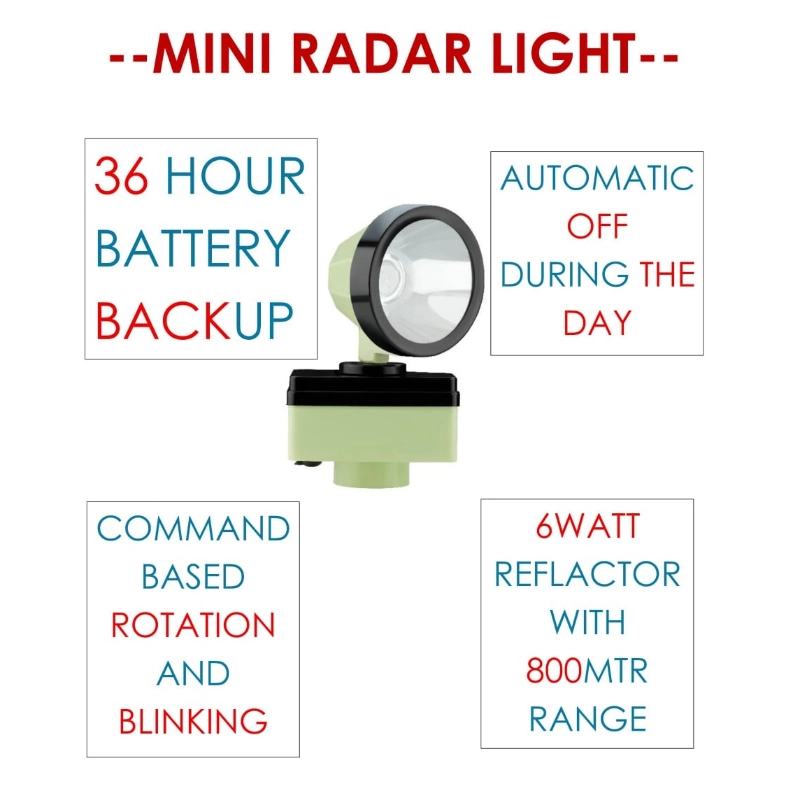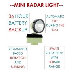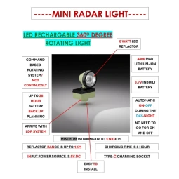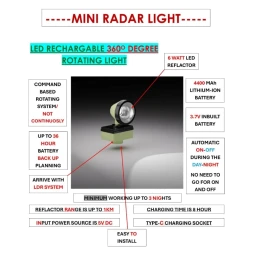 V-SAR Mini Radar 360 Rotating LED Light is an advanced, rechargeable lighting solution designed for reliable outdoor illumination. Equipped with a 6-watt reflector and 4400 mAh lithium-ion battery, it offers up to 36 hours of backup power. Its intelligent LDR sensor enables automatic day-night operation, eliminating manual effort. The light rotates on command (not continuously), providing 360° coverage with up to 1 km range. Built with Type-C charging, 8-hour recharge time, and easy installation, it’s perfect for farms, construction sites, and outdoor safety applications.