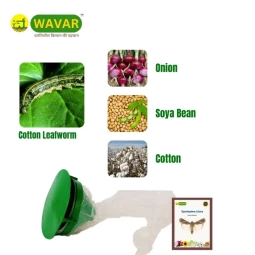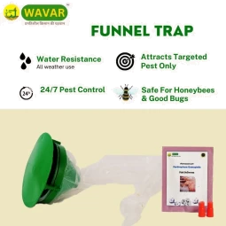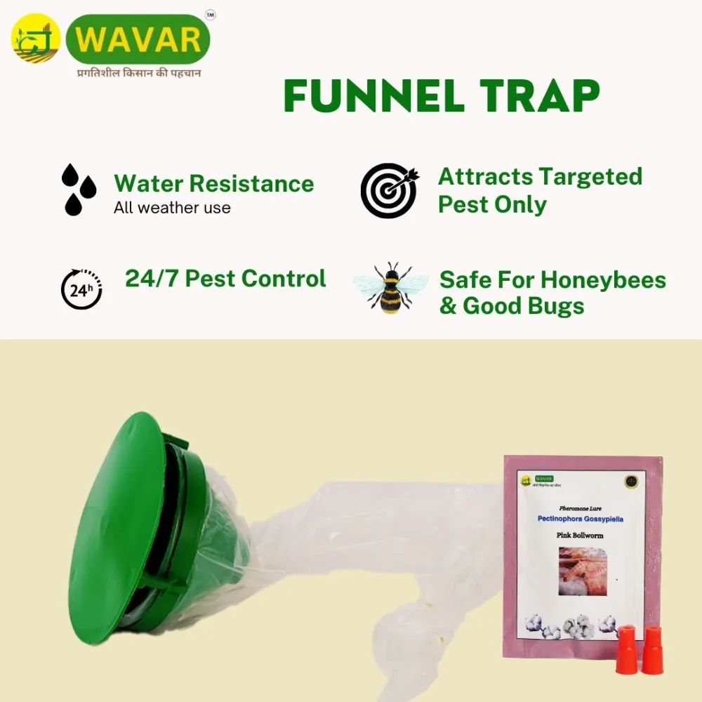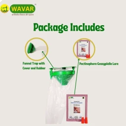 Wavar Funnel Trap with Lure for Pink Bollworm (Pectinophora gossypiella) is an eco-friendly and effective pest management solution to protect crops from severe damage caused by crown and fruit borers. The larvae, pale pink in color, infest young crowns, buds, and fruits, leading to significant crop loss. This funnel trap uses a lure to attract moths, thereby reducing the pest population and preventing further damage. Designed for ease of use, the trap helps minimize pesticide use and promotes healthy crop growth.