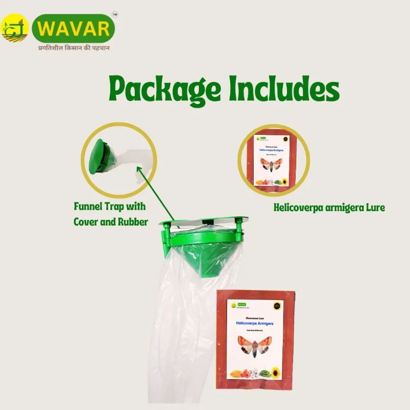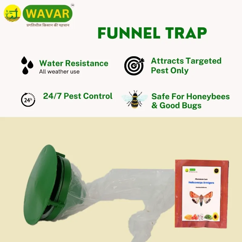 Wavar Funnel Trap with Helicoverpa Armigera Lure is a reliable pest control solution designed to target and reduce populations of the American Bollworm, one of the most destructive pests affecting major crops. With its specialized lure, the trap ensures high efficiency in attracting and capturing Helicoverpa Armigera moths. Built with durable, weather-resistant materials, it provides long-term field performance and can be reused for multiple crop cycles. This eco-friendly and cost-effective trap helps farmers safeguard their crops, reduce pesticide dependency, and improve yield quality.
